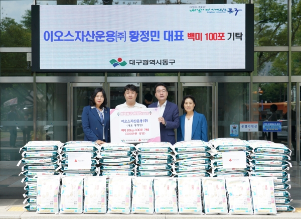 이오스자산운용(주)(대표 황정민)는 지난 5일 동구청을 방문, 어려운 이웃을 위해 사용해달라며 백미 10kg 100포(300만원 상당)를 기탁했다.