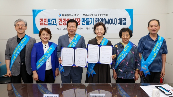 대구 중구(구청장 류규하)는 8일 번개시장(태평로 177-1)에서 번개시장 활성화통합상인회(회장 화은경)와 검진받고 건강한 시장 만들기 업무협약(MOU)을 체결했다.