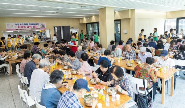 대구 수성구 수성2·3가동 새마을협의회·부녀회는 지난 6일 함장종합사회복지관에서 ‘수성2·3가동 사랑의 삼계탕 나눔행사’를 열어 공설경로당 3개소 회원 등 어르신 90여 명에게 삼계탕을 대접했다.
