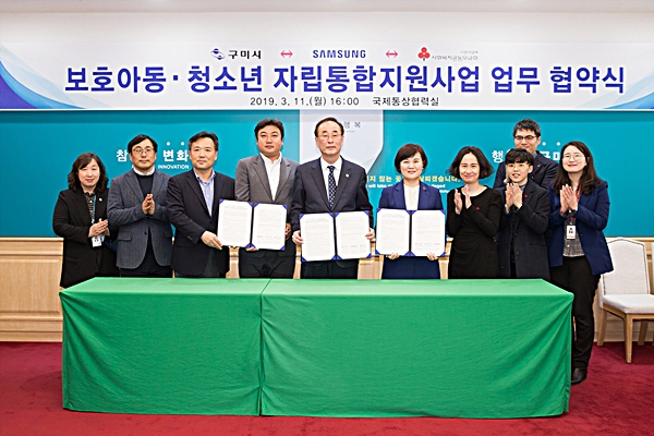 구미시(시장 장세용)는 지난 11일 오후 시청 국제통상협력실에서 ㈜삼성전자, 사회복지공동모금회와 보호 종료 아동의 자립을 지원하기 위한 ‘보호 아동·청소년 자립통합지원사업’ 추진 업무협약을 체결했다.