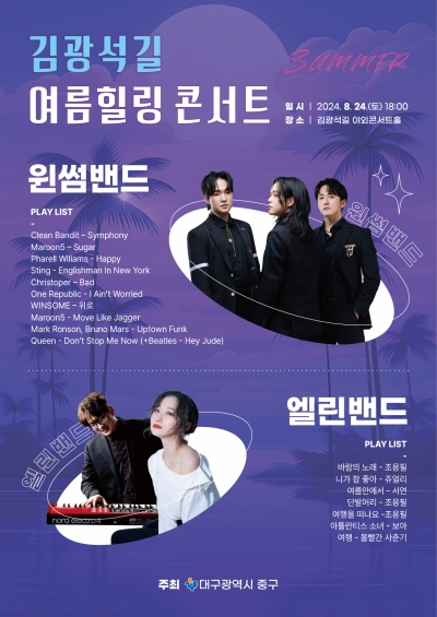 대구 중구(구청장 류규하)는 24일 오후 6시 김광석길 야외콘서트홀에서 8월의 여름밤을 장식할 여름 힐링 콘서트를 개최한다.