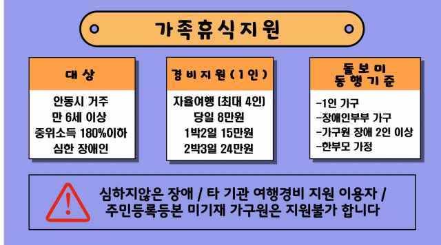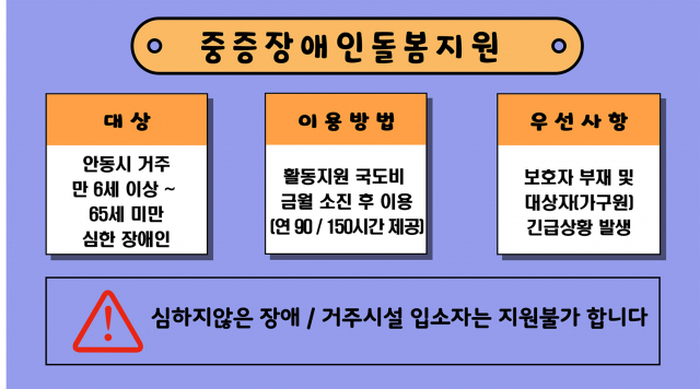 중증장애인돌봄 및 가족휴식지원사업은 도전적인 행동이나 장애가 있는 중중장애인가족을 돌보느라 힘든 시간을 보내고 있는 장애인가족들의 어려운 현실에 공감하여, 장애인가족들에게 실질적인 편의와 휴식을 지원하기 위한 권기창 안동시장의 공약 사업입니다. 이용을 원하는 안동시 거주 장애인가족들의 많은 참여를 바랍니다.