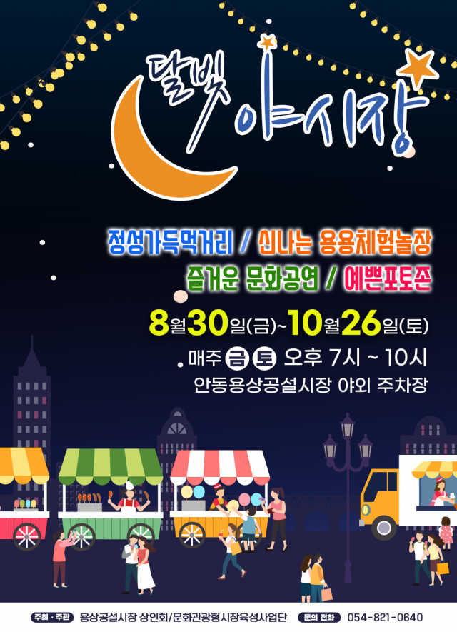 안동시(시장 권기창)는 8월 30일(금) 용상공설시장에 ‘달빛야시장’을 개장한다고 밝혔다. 야시장은 8월 30일 오후 6시 개장식을 시작으로 10월 26일까지 매주 금, 토요일 저녁 7~10시에 운영된다.