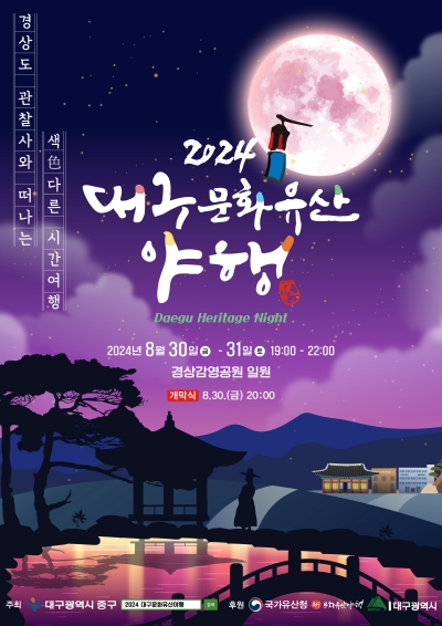 류규하 중구청장은 “역사가 살아숨쉬는 경상감영공원과 주변의 다양한 문화시설을 야간까지 즐길 수 있는 2024 대구 문화유산 야행은 여름의 끝자락에서 우리 모두에게 뜨거웠던 여름의 추억을 선사해 줄 것”이라며 “가족이나 연인, 친구들과 함께 행복하고 기억에 남는 좋은 추억을 남기시길 바란다”고 말했다.