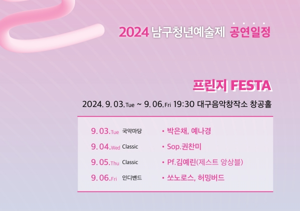 2024 남구청년예술제 「남구와 벗-하다」는 다음 주 9월 11일(수)부터 13일(금)까지 대덕문화전당 드림홀에서 축제를 이어가며 전 프로그램의 입장료는 무료로, 사전 예약 또는 공연 당일 선착순으로 입장할 수 있다. (문의: 053-664-3118, 5세 이상 입장)
