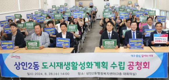대구 달서구(구청장 이태훈)가 28일 오후 2시 상인2동행정복지센터에서 주민과 관련 전문가 등 100여 명이 참석한 ‘상인2동 도시재생활성화계획 수립을 위한 공청회’를 개최했다.