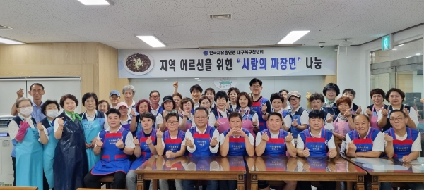 한국자유총연맹 대구북구청년회(회장 유성근)는 지난 8월 27일(화) 선린복지관에서 지역 어르신 160명을 모시고 짜장면 나눔 봉사활동을 펼쳤다.