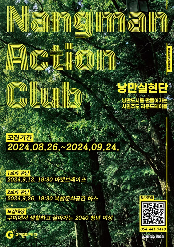 구미문화재단(대표이사 이한석)은 2040 구미 여성들을 대상으로 구미의 낭만을 발견하여, 낭만 도시를 만들어가기 위한 구미시민 라운드테이블 '낭만실현단' 프로그램을 추진한다.