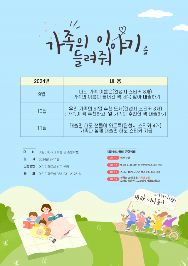 기타 자세한 사항은 달성도서관 어린이자료실(☎053-231-2175)로 문의하면 된다.