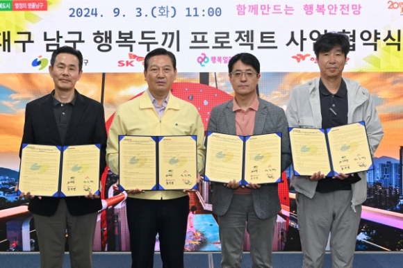 대구 남구는 3일 SK매직, 행복나래주식회사(행복얼라이언스 사무국), 행복도시락 사회적협동조합과 함께 『대구 남구 행복두끼 프로젝트』 사업 업무협약(MOU)을 체결했다고 밝혔다.