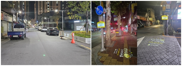| ↑↑ 대구행복기숙사 인근 안전한 밤길 위한 안심귀갓길 조성 완료_도로표지병(좌), 신고표지판 및 로고젝터(우) |