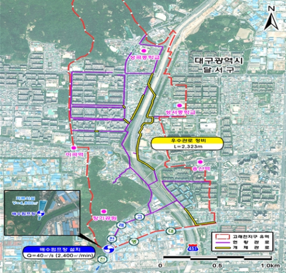 공모에 선정된 지역은 달서구 장기동, 용산동 일원이다. 지방하천인 대명천과 합류하는 고래천은 대명천의 계획홍수위보다 구거의 상단고가 낮아 대명천의 외수위 상승 시 원활한 내수배제가 불가능하다. 또한, 대명천의 유량이 역류해 도로 침수 등 피해가 반복적으로 발생하는 지역이다.