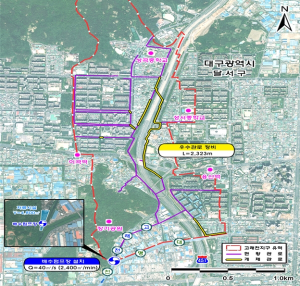 달서구는 이를 예방하고, 주민의 생명과 재산을 보호하기 위해 2023년 5월 ‘자연재해위험개선지구’로 지정했다. 2024년 4월 공모사업을 신청해 행정안전부와 대구시에 지역의 실정과 개선을 적극 건의하여 2025년 실시설계 추진을 위한 예산 국비 8억원, 시비 4억원 등 사업비 16억원을 우선 확보했다.