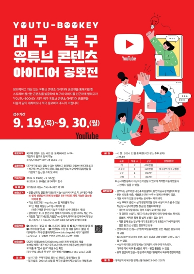 대구 북구청(청장 배광식)은 다양한 스토리와 참신한 콘텐츠를 발굴하여 북구의 이미지를 친근하게 알리고, 구정 홍보 효과를 강화하고자 「YOUTU-BOOKEY」 대구 북구 유튜브 콘텐츠 아이디어 공모전을 개최한다고 밝혔다.