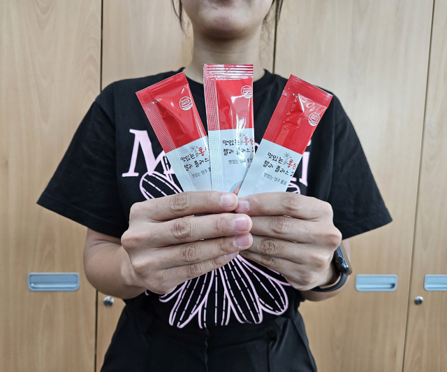 제공되는 홍삼간식은 학생들의 선호도조사 결과에 따라 홍삼젤리스틱 제품으로 선정했다. 해당 제품은 학생들의 기호에 맞게 홍삼과 사과즙의 적절한 배합으로 쓴맛을 잡고 젤리형태로 먹기 간편해 학생들이 홍삼에 대한 거부감 없이 섭취하기 좋은 장점이 있다.