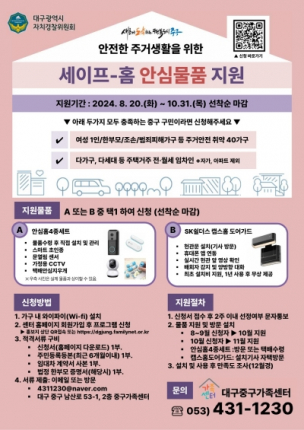 대구 중구(구청장 류규하)는 범죄예방과 사회적 취약계층의 주거 환경 개선을 위한 ‘세이프 홈 지원사업’ 대상자를 10월 말까지 선착순 모집한다.