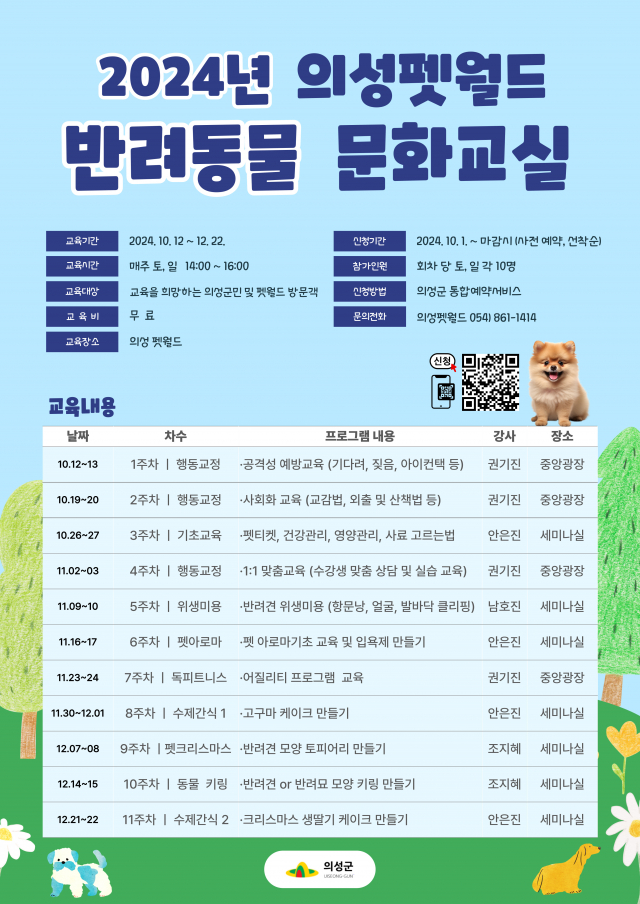 2024년 반려동물 문화교실 수강생 모집은 10월 1일부터 선착순 마감까지 모집할 예정이며 의성군 통합예약 시스템에서 예약이 가능하다.