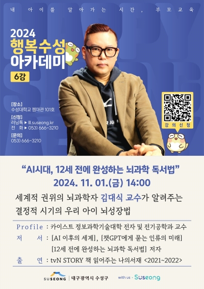 대구 수성구는 다음 달 1일 수성대학교 젬마관 101호에서 수성구 거주 (예비)부모, 조부모 등 양육자 200여 명을 대상으로 2024 행복수성아카데미 제6강 ‘AI시대, 12세 전에 완성하는 뇌과학 독서법’ 특강을 개최한다.