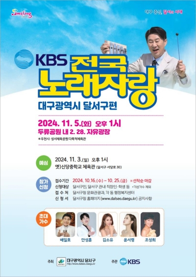 KBS 전국노래자랑 달서구편은 오는 11월 5일 오후 1시 두류공원 내 2.28. 자유광장에서 본선 무대가 펼쳐질 예정으로 10월 25일까지 참가 신청을 접수한다. 기성 가수를 제외한 달서구 거주자, 지역 내 직장인, 학생 등으로 동 행정복지센터 또는 구청 문화관광과로 방문 접수하면 된다.
