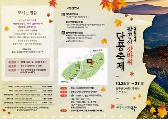 제23회 팔공산 단풍축제가 오는 25일부터 27일까지 3일간 팔공산 갓바위지구 광장(진인동)에서 열린다.
