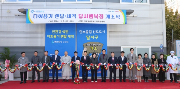 대구 달서구(구청장 이태훈) 대구달서행복지역자활센터(센터장 김태열)가 6일 오후 ‘다회용기 세척사업단 에코워싱 달서행복점’을 개소했다.