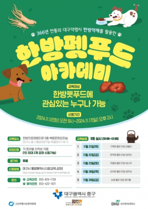 한편, 중구청은 아카데미 종료 후 한방 펫푸드 레시피 영상을 제작해 누구나 활용할 수 있도록 유튜브 등에 업로드할 예정이다. 자세한 내용은 대구시 중구청 누리집(www.jung.daegu.kr) 공지사항에서 확인할 수 있으며 예약 관련 053-422-1071, 교육 관련 053-819-1739로 문의하면 된다.