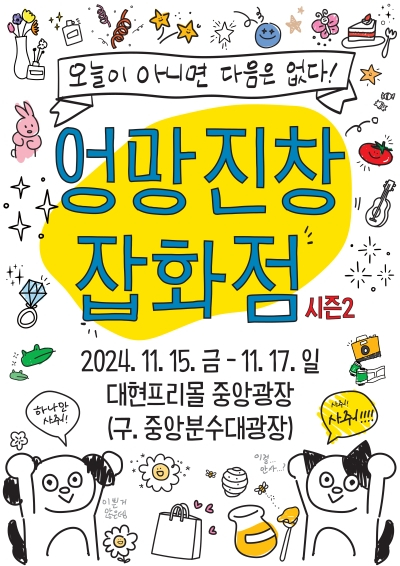 대구 중구(구청장 류규하)는 15일부터 17일까지 사흘간 매일 오후 2시부터 오후 6시까지 대현프리몰 중앙광장(대구지하철 1호선 중앙로역 지하상가)에서 ‘엉망진창 잡화점’ 프리마켓 행사를 개최한다.