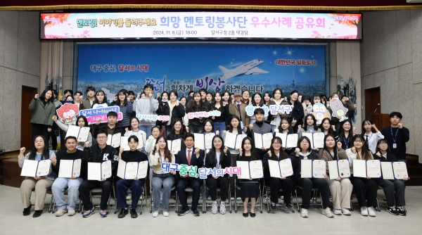 이태훈 달서구청장은 “한해 동안 수고한 희망멘토링 봉사단에게 감사를 전하며, 멘토링은 소중한 경험과 지혜를 다음 세대에 나누는 중요한 과정이며, 공유회를 통해 그동안 쌓은 값진 경험과 성과를 함께 나누고 더 나은 방향으로 성장해 나가기를 바란다.”고 전했다.