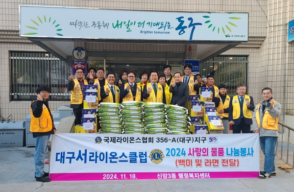 대구서라이온스클럽은 2014년, 동구 신암3동 행정복지센터와 업무협약을 맺은 후 11년째 뜻깊은 사랑의 나눔 손길을 이어가고 있다. 이날 기탁받은 물품은 저소득층 및 복지사각지대 지역 주민 90세대에 지원될 예정이다.