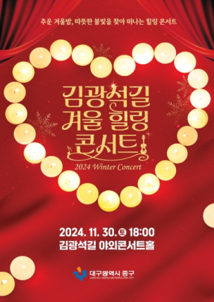 대구 중구청(류규하 중구청장)은 오는 11월 30일(토) 오후 6시부터 1시간 동안 김광석길 야외콘서트홀에서 연말 감성 가득한 수 천개의 캔들과 어울리는 진한 감동의 음악공연이 펼쳐진다고 밝혔다.