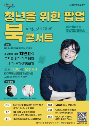 대구 중구(구청장 류규하)는 30일 오후 4시 청년들을 대상으로 ‘청년일상+@ 2024년 청년 팝업클래스’ 북콘서트를 국채보상운동기념도서관 문화공간 가온홀에서 개최한다.