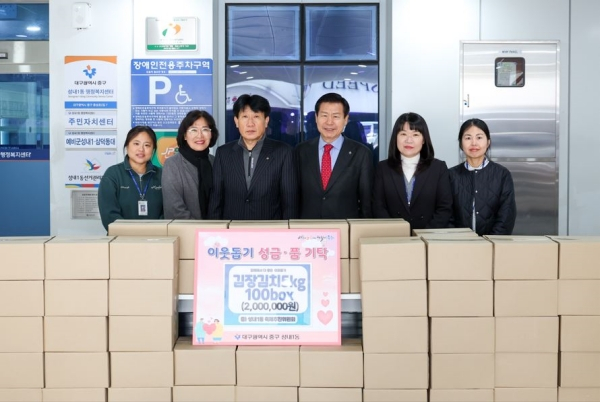 대구 중구 성내1동 축제추진위원회(위원장 이재근)는 지난 28일 주민을 위해 정성 담아 마련한 김장 김치 5kg 100박스를 성내1동 행정복지센터(동장 장미숙)에 기탁했다.