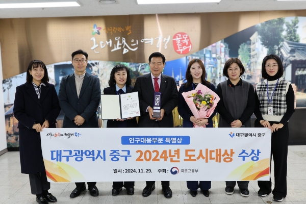 대구 중구(구청장 류규하)는 국토교통부가 주최하는 ‘2024년 대한민국 도시대상’ 우수정책(인구감소대응) 부문에서 특별상을 수상했다.
