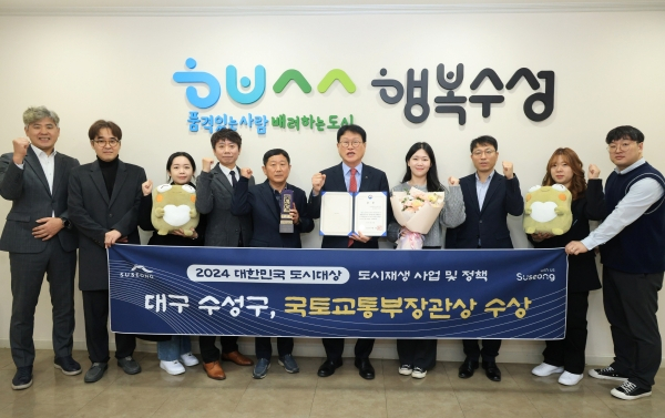 | ↑↑ 대구 수성구(구청장 김대권)는 ‘들안예술마을 & 생각을 담는 공간’이 ‘2024년 대한민국 도시대상’ 도시재생 분야 우수정책으로 선정돼 국토교통부 장관상을 수상하고 관계공무원과 기념 촬영하고 있다. |