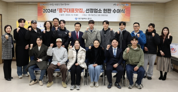 대구 중구(구청장 류규하)는 지난 9일 보건소 대회의실에서 중구 대표맛집 신규 선정업소 대표 등 20여 명이 참석한 가운데 중구 대표 맛집 지정서 및 현판 수여식을 개최했다.