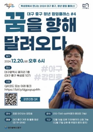 대구 중구(구청장 류규하)는 20일 오후 6시 청년들을 대상으로 ‘2024년 청년 팝업클래스’ 마지막 네 번째 클래스를 북성로 내 도심 캠퍼스 2호관(북성로 107)에서 개최한다.