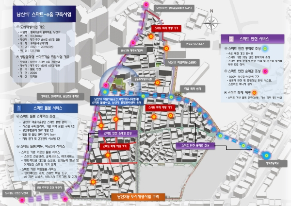 한편, 2020년부터 추진 중인 남산3동 도시재생 뉴딜사업(행복이음의 활력마을, 남산情)은 2025년까지 총 121억여 원의 사업비를 투입해 남산情 마음이음공간(복합커뮤니티센터), 골목특화공간, 마을안전가로 조성 등 정주여건 개선과 공동체 활성화를 위한 사업을 추진하고 있으며, 남산情 마음이음공간과 마을안전가로 조성 등의 사업을 스마트기술 지원사업과 연계한다.