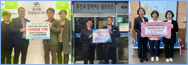 | ↑↑ 이시아한방병원후원금 기탁 공산동(좌), 불로봉무동(가운데), 지저동(우) |