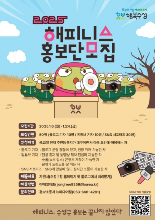 대구 수성구(구청장 김대권)는 주민 공감과 소통을 활성화하기 위해 1월 24일까지 ‘2025년 해피니스 홍보단’을 모집한다고 밝혔다.