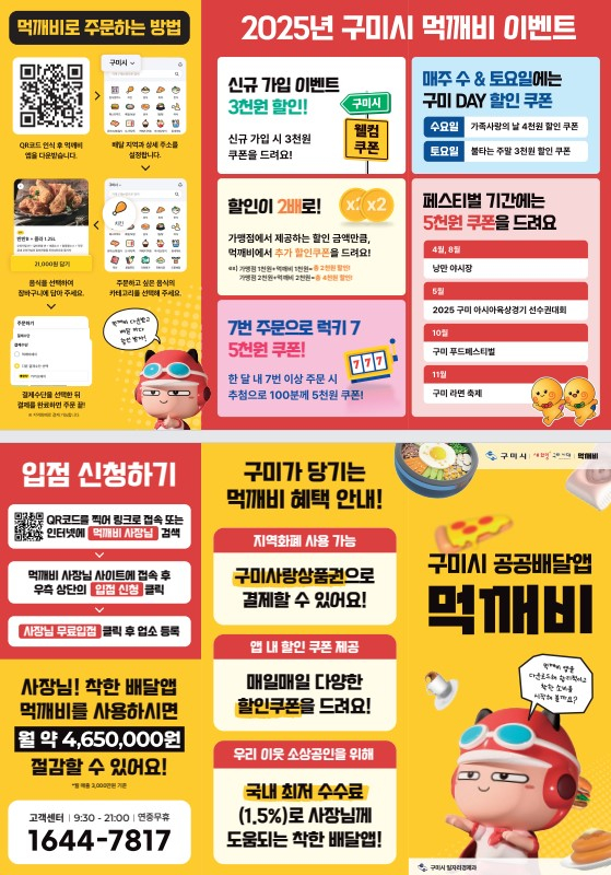 이번 이벤트는 △신규 가입자 대상 3,000원 할인 △매주 수·토요일 4,000원·3,000원 할인 △최대 4,000원까지 적용되는 더블할인 △7번 주문으로 럭키 7 이벤트 등 정기 할인으로 구성됐다. 또, △2025 아시아육상선수권대회 등 구미시 주요 축제와 연계한 비정기 할인 이벤트로 5,000원 할인 쿠폰이 지급된다.