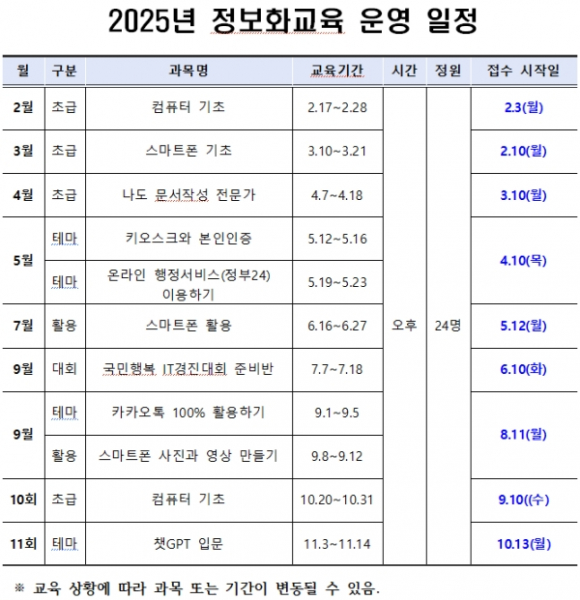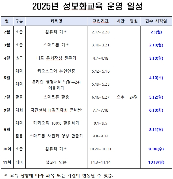교육기간은 2월~11월까지 8월 혹서기를 제외하고 9개월간 매월 1~2과목씩 20시간 교육으로 대명4동 행정복지센터 2층 정보화교육장에서 무료로 진행된다.