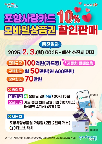 포항시는 2월 3일부터 카드형·모바일 포항사랑상품권(이하 포항사랑카드) 100억 원 규모로 10% 특별 할인판매를 시작한다고 밝혔다.
