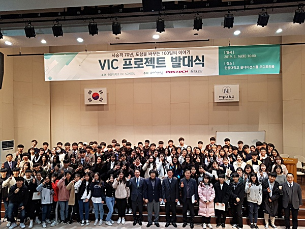 포항시는 지난 16일 한동대학교 올네이션스홀 오디토리움에서 시 승격 70년을 맞아 지역 대학생과 고등학생이 참여하는 기념사업인 ‘포항을 바꾸는 100일의 이야기 V.I.C 스쿨 프로젝트’ 발대식을 개최했다.