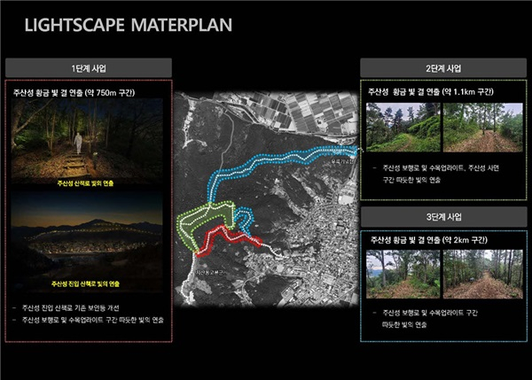 1단계 사업은 주산성의 역사적인 상징성과 품격을 위한 “황금빛 결”(지산동 고분군 ~ 주산성 외성 ~ 약수터), 2단계 사업은 빛 공해 없는 안전 조도 확보 및 쾌적한 공간 계획의 “절제의 빛”(주산성 내·외성 탐방로), 3단계 사업은 대가야의 상징적인 경관을 나타내는 따뜻하고 품격 있는 공간 계획을 위한 “품격의 빛”(주산성 정상 ~ 우륵기념탑)을 테마로 연출될 예정이다.