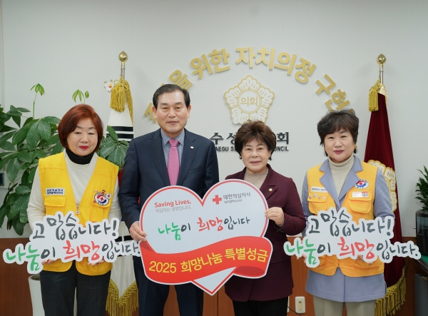 수성구의회는 6일 의장실에서 대한적십자사 대구광역시지사에 2025년도 적십자 희망나눔 특별성금 100만원을 전달했다.