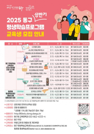대구 동구청(구청장 윤석준)은 3월 첫째 주까지 동구 평생학습교육센터와 동촌 평생학습센터 교육생을 모집한다.