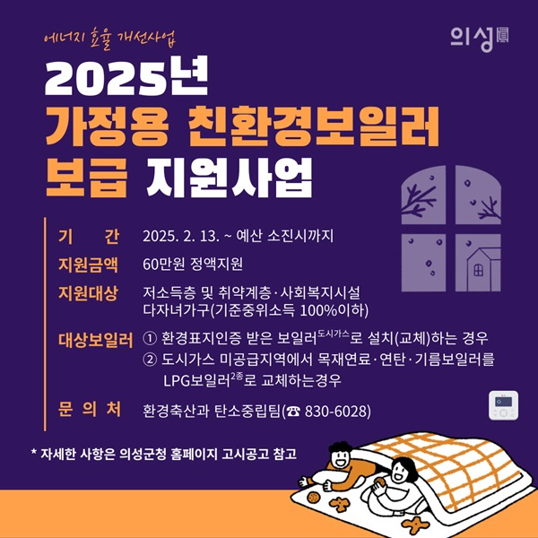 의성군(군수 김주수)은 취약계층을 대상으로 미세먼지 배출이 적고 열효율이 높아 난방비 부담을 줄일 수 있는‘가정용 친환경(저녹스) 보일러 설치’지원사업을 추진한다.