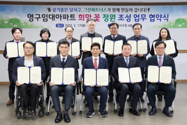 대구 달서구(구청장 이태훈)가 17일, 11개 유관 기관과 함께 영구임대아파트 내 녹지 공간을 확대하는 「희망 꽃 정원」 조성 사업을 위한 업무협약을 체결했다.