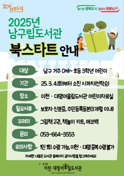 대구 남구는 오는 3월부터 구립도서관에서 0세∼초등 3학년 어린이에게 그림책 꾸러미를 제공하는 ‘북스타트’를 운영한다고 밝혔다.