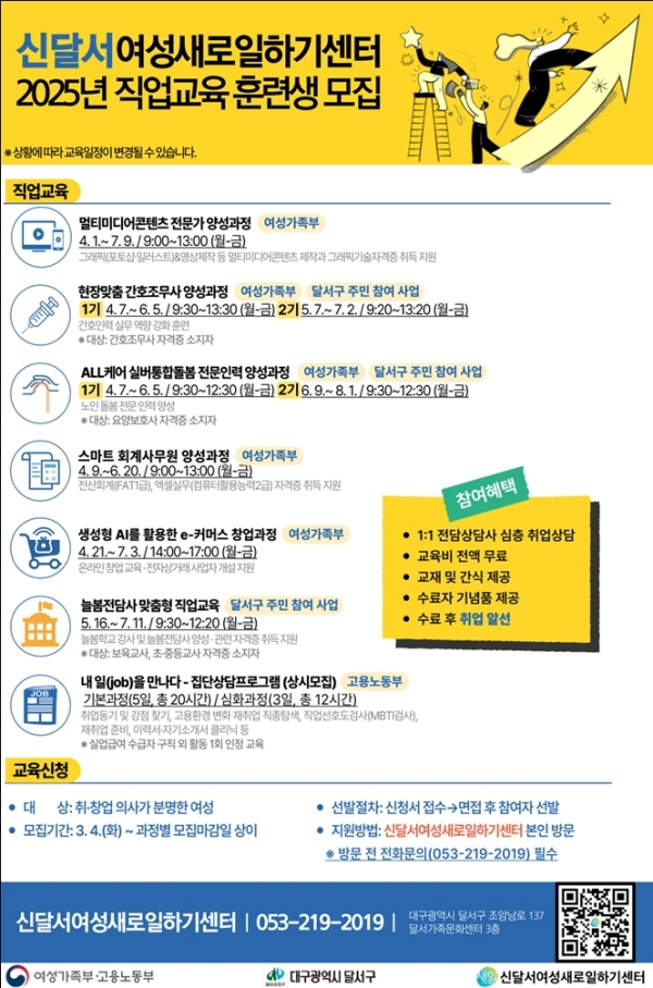 각 과정은 15~20명 정원으로 운영되며, 수료 후에는 취업 컨설팅, 일자리 알선, 전문가 특강, 동아리 활동 등 지속적인 사후 관리가 지원된다. 신달서여성새로일하기센터(www.sdsjob.or.kr)는 이번 과정을 통해 여성들이 전문성을 갖추고 안정적인 취업을 할 수 있도록 적극적으로 지원할 계획이다.